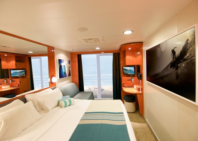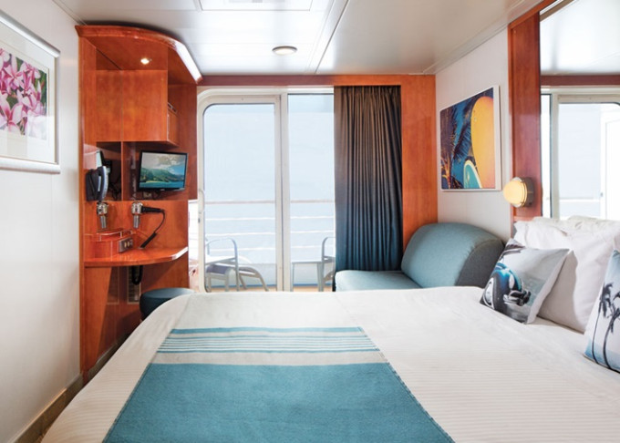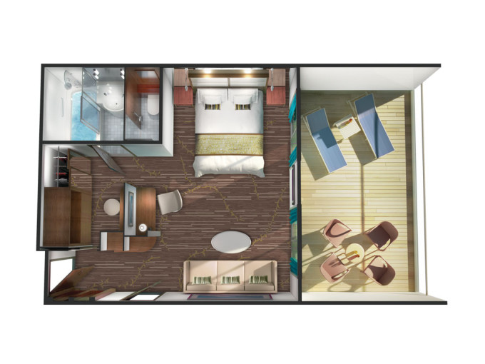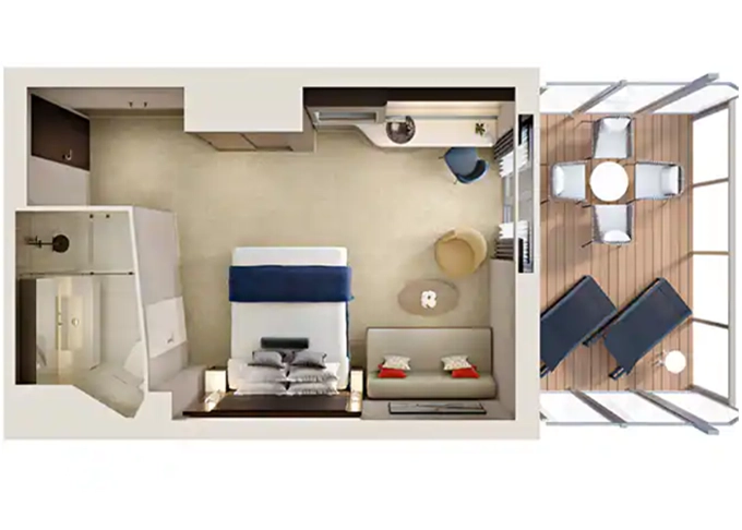 B1 - Kajuta s veľkým balkónom Aft-facing 21 m² / balkón 8 m². 7. až 10. paluba - vzadu. Max 3 osoby. 6 940 € 3 470 € za osobu