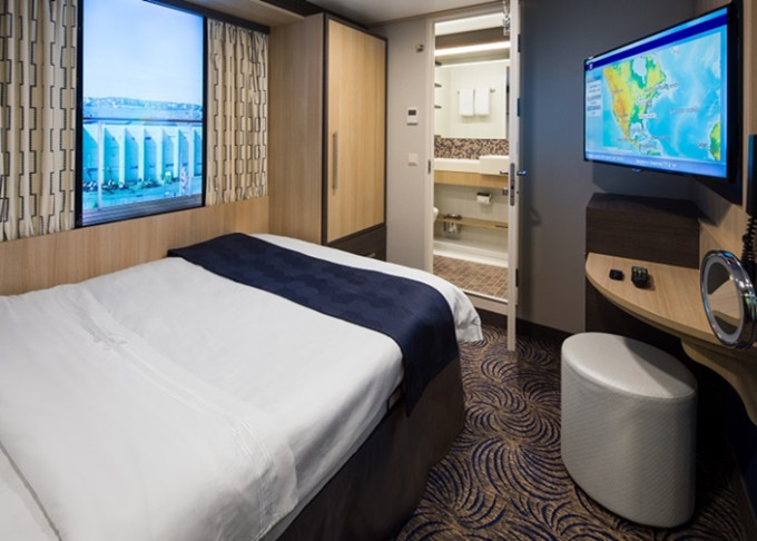 1U - Vnútorná kajuta s virtuálnym balkónom 15 m². Obrazovka veľkosti balkónových dverí s premietaným výhľadom. Centrálne umiestnenie. Max 3-4 osoby. 1 446 € 482 € za osobu